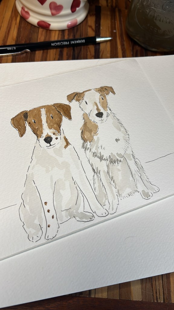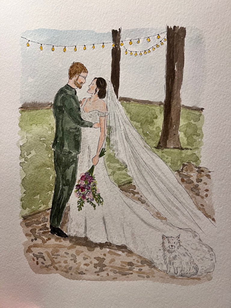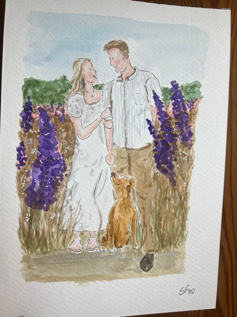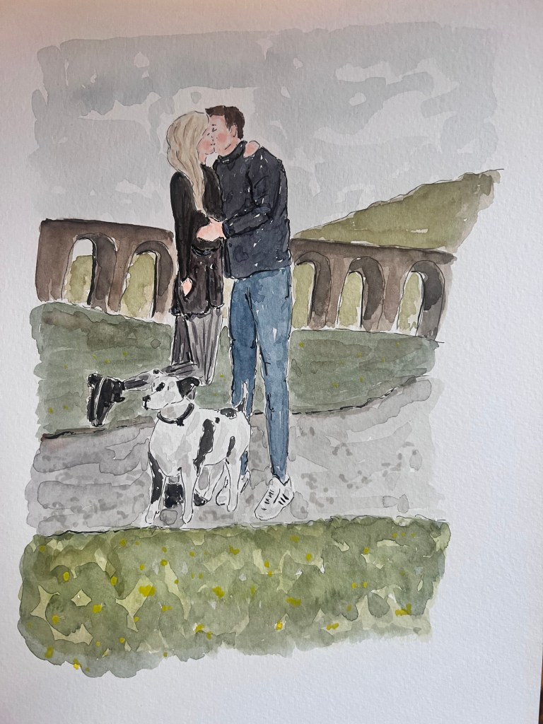 I create a quirky and totally unique bespoke illustration from your photos. I use watercolour paint, finished off with ink, on high quality watercolour card. photos do not need to be together or even in the scene you would like. I can create your ideal illustration and change any details you like such as clothing, person or pet position, location, weather, you name it and I can make it happen.