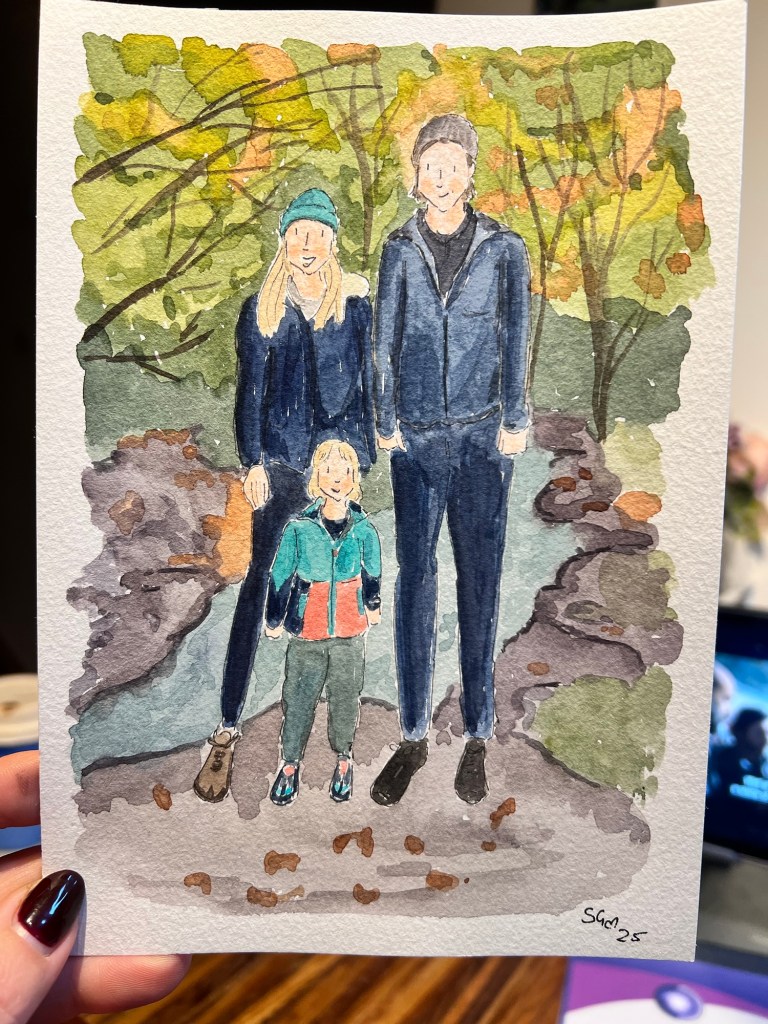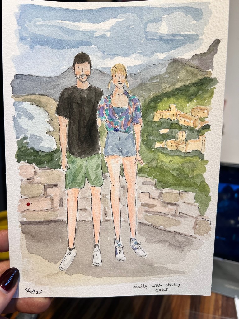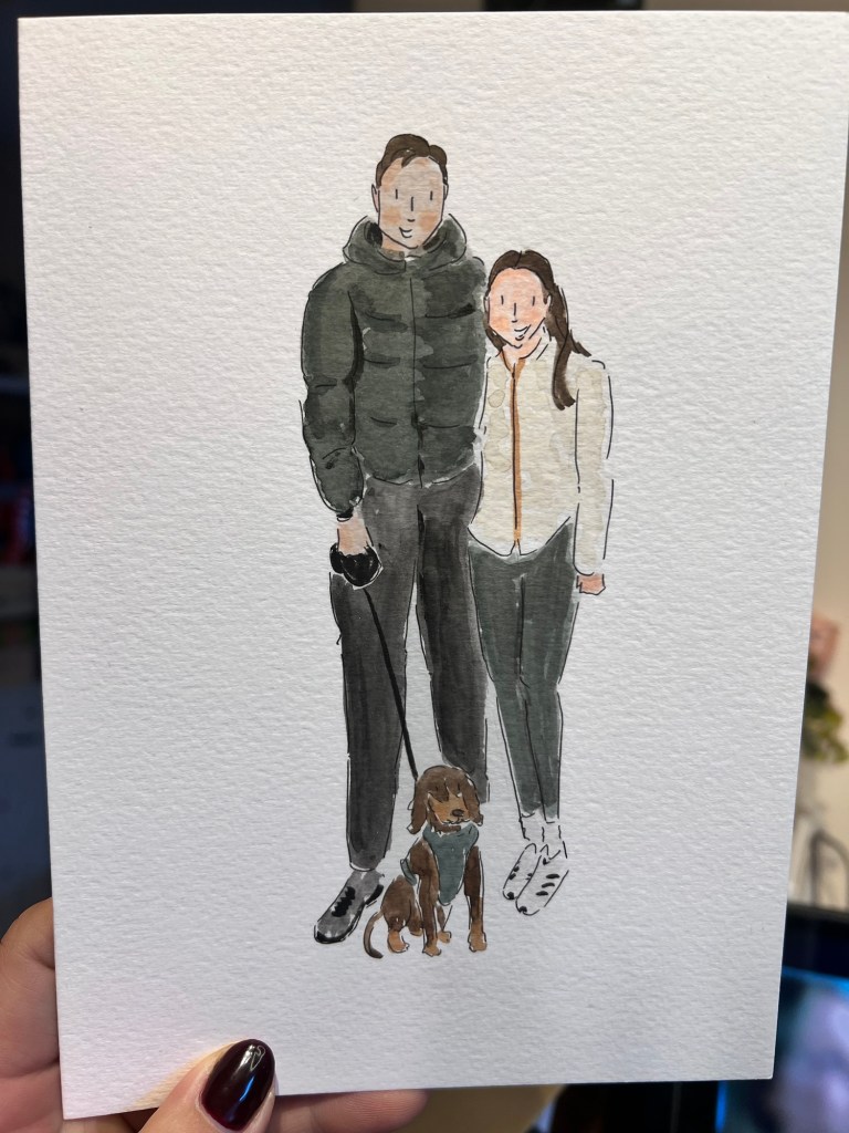 I create a quirky and totally unique bespoke illustration from your photos. I use watercolour paint, finished off with ink, on high quality watercolour card. photos do not need to be together or even in the scene you would like. I can create your ideal illustration and change any details you like such as clothing, person or pet position, location, weather, you name it and I can make it happen.